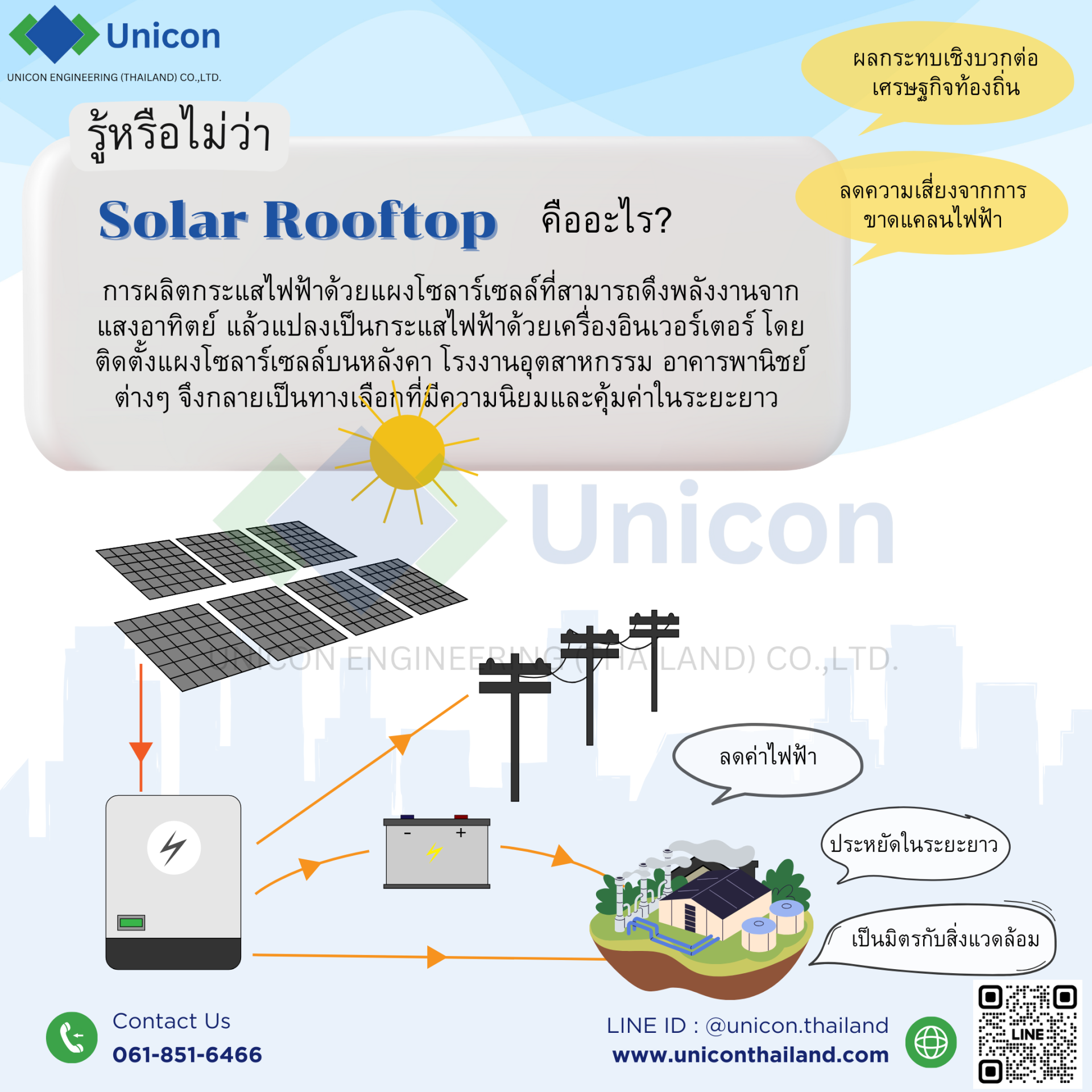 Solar Rooftop การผลิตกระแสไฟฟ้าด้วยแผงโซลาร์เซลล์ที่ติดตั้งบนหลังคาหรือ Solar Rooftop เป็นการใช้พลังงานจากแสงอาทิตย์มาผลิตกระแสไฟฟ้าโดยผ่านกระบวนการที่แผงโซลาร์เซลล์ดึงพลังงานแสงแดดและแปลงเป็นกระแสไฟฟ้า ผ่านเครื่องอินเวอร์เตอร์ ก่อนส่งกระแสไฟฟ้าไปใช้งานในอาคาร โรงงาน หรืออุตสาหกรรมต่างๆ