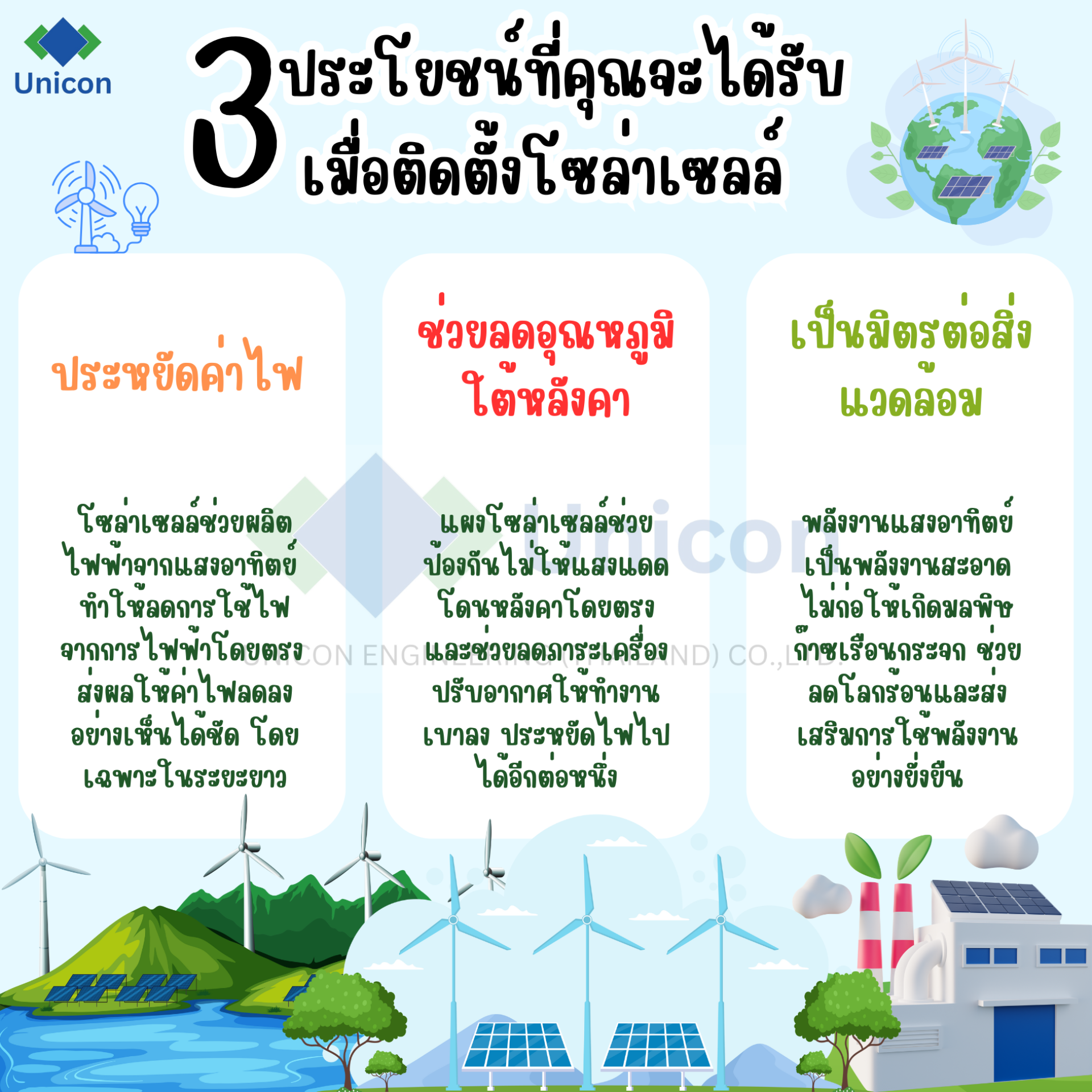 โซล่าเซลล์ไม่เพียงแต่เป็นทางเลือกที่ดีในการประหยัดค่าใช้จ่ายด้านพลังงาน แต่ยังเป็นการช่วยรักษาสิ่งแวดล้อมและส่งเสริมการใช้พลังงานอย่างยั่งยืนให้กับโลกของเรา หากคุณกำลังมองหาทางเลือกในการลดค่าใช้จ่ายและช่วยโลกไปพร้อมๆ กัน การลงทุนในโซล่าเซลล์ก็เป็นอีกหนึ่งทางเลือกที่คุ้มค่าและยั่งยืนในระยะยาว