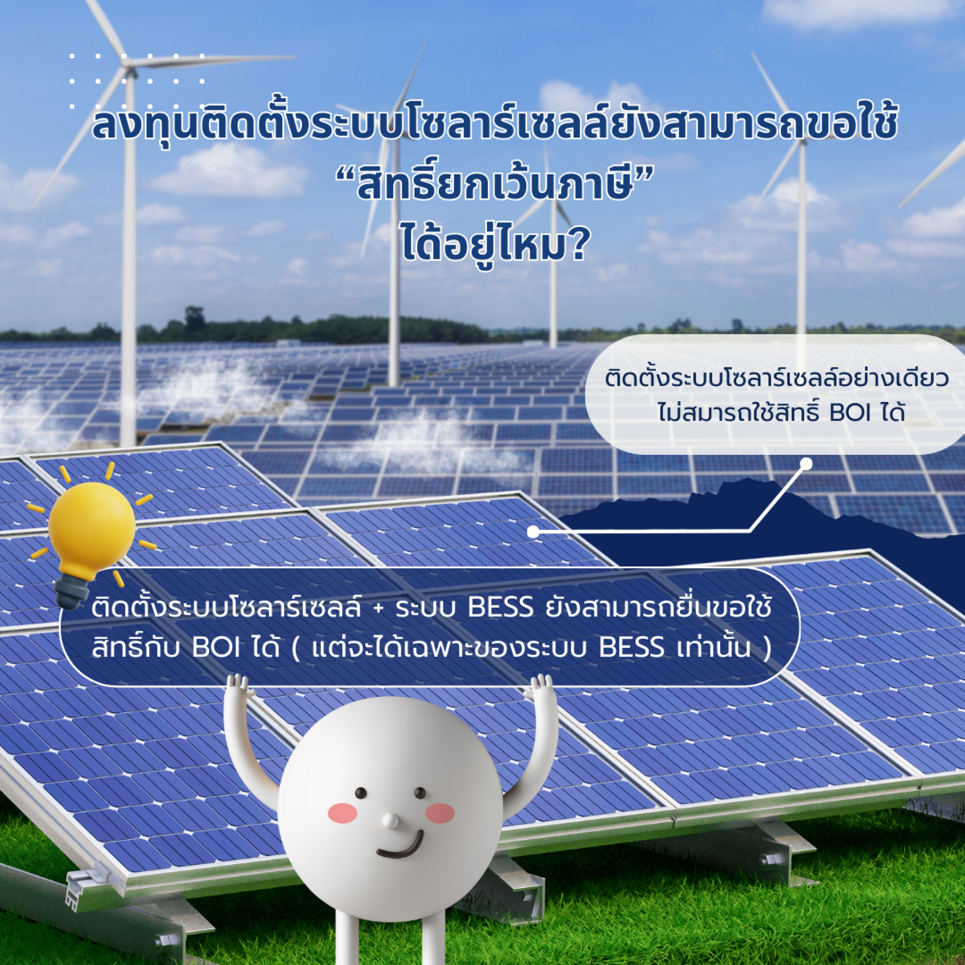 • แต่ถ้าติดตั้ง โซลาร์เซลล์ + ระบบกักเก็บพลังงาน (BESS) สามารถขอรับสิทธิ BOI ได้ แต่สิทธิ์นั้นจะครอบคลุมเฉพาะ ระบบ BESS เท่านั้นไม่รวมโซลาร์เซลล์
